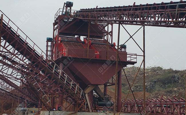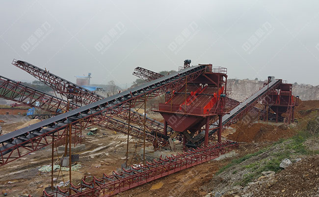 此條生產(chǎn)線時產(chǎn)600噸;基本配置:PCZ1615重型錘式破碎機(jī)、PC1213錘式破碎機(jī)、ZG1538給料機(jī)、3YKZ2670×2振動篩、2YKZ2670×2振動篩。