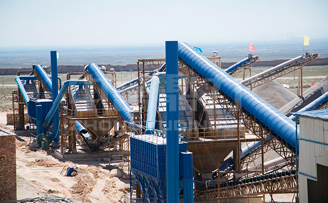 位于寧夏銀川的這條時產800噸的碎石子生產線在2017年已開始投產,該項目屬于新建產線。整體的設備配置以及設計施工均由中譽鼎力承包。在設備的選擇上,使用重錘破加細碎整形機的搭配,很好的運用了重錘破一破成型的特點,減少了產線的設備投入,同時也保障了出料的粒度良好。該碎石子生產線中在傳輸、篩分以及破碎等環節都進行了封閉,并且還搭配了袋式除塵器,保障了產線的環保效益。