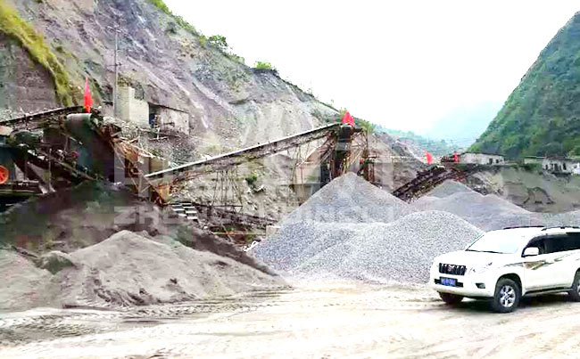 這條硬巖濕法制砂生產線位于四川峨邊,由中譽鼎力提供設備以及相關的安裝服務,項目于2016年9月已正式完工并開始投產,運行中的生產線每小時產量在250-350噸,根據處理的物料性質不同產量也會發生一些變化,屬于正常現象。生產線在設備上采用了重錘式破碎機、硬巖破碎機加輪式洗砂機的配置,大致的工藝流程為物料由給料機送至重錘式破碎機的破碎腔中進行粗碎處理,該設備具有破碎比大的特點,能夠很好的處理硬石料,然后再由傳送帶將物料帶到二級硬巖破碎機中,進行細碎處理,之后由振動篩篩分出不同粒度的成品碎石料,然后部分物料在經過輪式洗砂機清洗過后再進行篩分入庫。