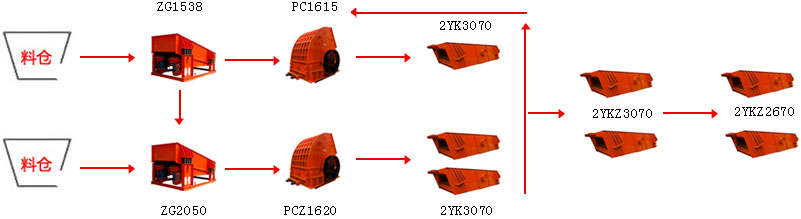 生產過程:原料--振動給料機--錘式式破碎機--輸送機--入反擊式破碎機--輸送機--振動篩進行篩分,就可生產出成品石料。