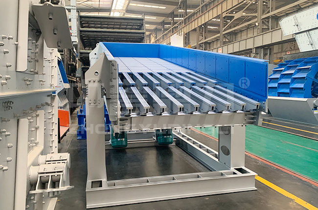 振動喂料機又稱振動給料機,可把塊狀、顆粒狀物料從貯料倉中均勻、連續地給到受料裝置中去,在砂石生產線中可為破碎機械連續均勻地喂料,并對物料進行粗篩分,廣泛用于冶金、煤礦、選礦、建材、化工、磨料等行業的破碎、篩分聯合設備中。