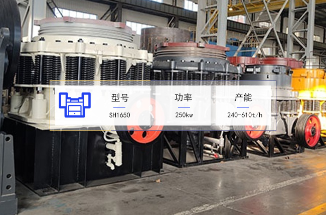 SH1650彈簧圓錐破碎機(jī)是臺中產(chǎn)能石料加工設(shè)備,可破碎粒度小于330毫米的石頭,細(xì)碎后的出料粒形在25-74毫米間,電機(jī)功率是250千瓦,時產(chǎn)量可達(dá)240-610噸,設(shè)備的重量可達(dá)35噸。