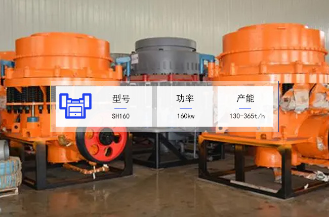SH160圓錐破碎機是臺小型石料破碎設備,有多種破碎腔,進料粒度不大于240mm,出料規格在20-71mm間,配置的電機功率為160kw,一小時處理量是130-365噸,整機的自重可達30噸。